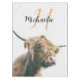 Highland cow portrait custom name initial monogram. Portrait photograph of a majestic orange brown highland cattle on a foggy day with white background.