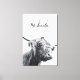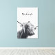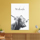 Highland cow portrait custom name initial monogram in black and white. Portrait photograph of a majestic highland cattle on a foggy day with white background in black and white.