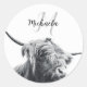 Highland cow portrait custom name initial monogram in black and white. Portrait photograph of a majestic highland cattle on a foggy day with white background in black and white.