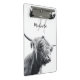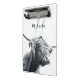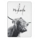 Highland cow portrait custom name initial monogram in black and white. Portrait photograph of a majestic highland cattle on a foggy day with white background in black and white.