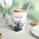 Highland cow portrait custom name initial monogram in black and white. Portrait photograph of a majestic highland cattle on a foggy day with white background in black and white.