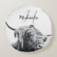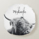 Highland cow portrait custom name initial monogram in black and white. Portrait photograph of a majestic highland cattle on a foggy day with white background in black and white.