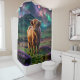 Beautiful Highland cow surrounded be luscious green Mountains and colourful nebulas in the sky.