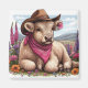 Illustration of a cute Highland cow wearing a cowboy hat and bandanna, surrounded by colourful wildflowers and a scenic landscape.