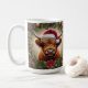 A charming Highland cow wearing a Santa hat amidst a festive arrangement of pine cones, holly, and ornaments. Perfect for celebrating the holiday season with a touch of rustic charm.