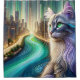 This stunning artwork features a cat with striking features and fur patterns in shades of purple and blue, gazing out of a high-rise window. The cat’s vibrant green eyes stand out as it looks towards the vibrant cityscape below. The background showcases tall buildings alongside a winding river waterscape that reflects light in various hues of green and blue. The contrast between the natural elegance of the cat and the stylised urban environment creates a captivating and serene atmosphere.