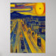 Car driving on the highway in the city, colourful sky, yellow sun and a mountain in the background in the style of Edvard Munch. This is a AI generated art.