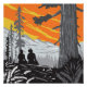 Illustration of hikers sitting on log in Boy Scout Tree Trail in Jedediah Smith Redwoods State Park east of Crescent City in California done in retro woodcut WPA style.
