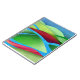 An abstract landscape with vibrant colours and textures showing hills floating on ice in shades of green, blue, cyan, red, and pink.