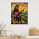 This dynamic artwork portrays a lion, looking effortlessly cool in sunglasses and a leather jacket, masterfully "shredding" an electric guitar while perched on a rock. The scene unfolds across rolling green hills and distant trees under a vast, fiery sunset sky. The thick, expressive impasto creates a tangible texture, making the "Rock or Die" declaration resonate with the raw energy of the performance.