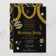 A hip hop 90's style gold Cuban link chain birthday party invitation design perfect for birthday parties with a hip hop theme. Customize this hip hop birthday invitation with your text. Hand drawn Cuban link chain and accessories on a black background.