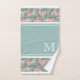Beautiful contemporary pastel pink flamingos on green palm leafs on light aqua turquoise and pale blue watercolor paint brush strokes pattern. With room to customise or personalise with name, monogram or initials of your choice. Ornate, whimsical and funky design available on a variety of fun, classy and fashionable bathroom décor accents and beach essentials.