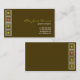 Chocolate brown business card with lime and salmon accent squares.
