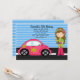 Start your celebration off right with this adorable hippie girls birthday party invitation. It's adorable with a hippie girl sanding next to a hot pink buggy with flowers on it. She's wearing a multi coloured tie die shirt with a matching headband in her long brown hair.It has a dark and light blue striped background. Check out the many other products and designs in this line. ©JW Illustrators