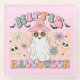 Cute, colourful, fun Hippie Halloween coaster features a hippie ghost with pink witch hat, text that reads Hippie Halloween, and some flowers and little bats and skulls in lavender, melon, aqua, and pink!