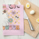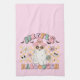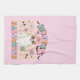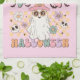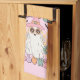 Cute, colourful, fun Hippie Halloween kitchen towel features a hippie ghost with pink witch hat, text that reads Hippie Halloween, and some flowers and little bats and skulls in lavender, melon, aqua, and pink!