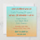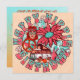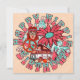 Birthday invitation with coral and teal retro colours hippie symbols such as a peace sign, flower, hippie girl, RV.