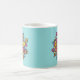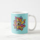 Psychedelic eye mug with a digital art of a weird eyeball with reptile iris and pupil surrounded with colourful petals. This crazy surreal illustration has fun yellow, orange, coral, pink and light blue colours with decorative elements over customisable light blue background and, being so strange, is great for Halloween.