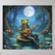 This whimsical poster features a frog musician strums an acoustic guitar on a lily-pad under a glowing full moon in an enchanted, moonlit forest pond - serene, magical scene.