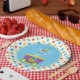 This party plate features a blue background surrounded by a repeating patter of red, blue, yellow and green stars. A cute baby hippo (hippopotamus) wearing a party hat in a purple train car sits in the middle of the plate.