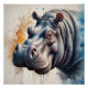 A Hippopotamus with detailed watercolor with expressive eyes is portrayed against a soft, blurred background. The natural colours enhance the lifelike appearance.