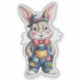 A cute cartoon illustration of a bunny wearing a gray fedora hat with a red band and round wire-rimmed glasses. The bunny has a cheerful expression with rosy pink cheeks and a small smile. It is wearing denim overalls with colorful patch details - yellow, pink, green, and blue squares sewn onto the legs. A red polka-dotted bow tie adorns its neck. The bunny's fur is rendered in light beige with subtle gray tones, and its ears are perked up and forward. The bunny is standing in a three-quarter view pose against a pure white background. The art style is soft and watercolor-like with clean lines and gentle shading. The overall composition has a whimsical, child-friendly aesthetic with a hipster-inspired outfit.