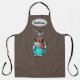 Fun and modern winter / holiday themed apron features illustration of hipster deer wearing holiday sweater and scarf, with customisable name oval on brown background