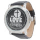 An impactful art piece featuring the words HIS LOVE ENDURES FOREVER in white lettering on a black background, accompanied by a cross and Psalm 136:1. The design includes a bold white cross within a circular emblem, emphasising the spiritual message. A powerful item perfect for expressing faith and devotion.