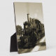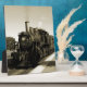A sepia photograph of an historic steam locomotive as it chugs out of the past; a beautiful gift for any train aficionado.