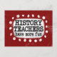 "History Teachers Have More Fun" is a cute text design in red with black text, along with a white accent shape and white textured whimsical dots surrounding it.