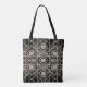 Hive Mind all-over print shoulder and cross-body tote bags. Hive Mind is an abstract techno design created by Anna M. Asbury and consists of a black background with a faded khaki design.