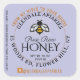 Personalise this honey label with your apiary name, street or owner name & location, net weight. "Pure Raw" is written in a script font and "Honey" in an elegant capitalised font beneath a catchy-looking "windowpane" honeybee. Facebook handle and infant warning.