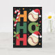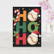 This Christmas card is charming because it mixes holiday tradition with a playful, creative look. The card uses vibrant colors that really stand out against a deep black background. The main design is the phrase 'HO HO HO' spelled out using various festive items. This phrase is cleverly formed by mixing elements like holly, candy canes, baseballs, and Santa hats. This unique combination of traditional Christmas items and unexpected elements creates a visually striking card perfect for spreading cheer.