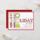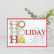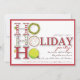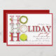 Send a happy Ho Ho Ho to invite your family and friends to your holiday party with this fun design that uses a wreath, a sugar cookie, and a christmas ornament to spell out the greeting. Added a little candy cane stripes, mistletoe, and holly to complete the festive look.