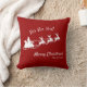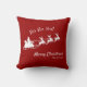 Add a fun seasonal touch to your home with this custom red and white throw pillow. Throw pillow features red background with white Merry Christmas greeting and Ho Ho Ho text, your family last name, and Santa Claus flying in his sleigh with reindeer.