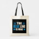 Hockey Blue Line tote bag features blue pucks and hockey sticks with white and blue text that reads The Blue Line is Mine.