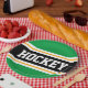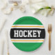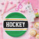 This sporty, athletic design features bold HOCKEY text inside a highlighted wide centre black stripe with white and yellow pinstripes against bright green outer stripes. The text can be personalised.