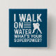 Hockey player button with a humourous saying features white text on a blue background and a white silhouette hockey player. The text on this hockey player bag reads I Walk on Water What's Your Superpower?