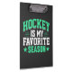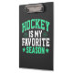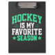 Hockey clipboard with green and white text on a black background reads Hockey is My Favourite Season!