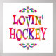 If you love hockey, you'll enjoy this colourful design with flourishes and the words Lovin' Hockey.