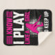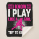 Hockey Play Like a Girl sherpa blanket features a silhouette female hockey player and text reads I Know I Play Like a Girl Try to Keep Up!