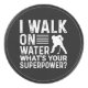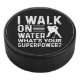 Hockey theme puck with white silhouette hockey player with hockey stick and white text that reads I Walk On Water What's Your Superpower?