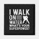 Hockey theme magnet with white silhouette hockey player with hockey stick and white text that reads I Walk On Water What's Your Superpower?