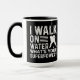 Hockey theme mug with white silhouette hockey player with hockey stick and white text that reads I Walk On Water What's Your Superpower?