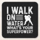 Hockey theme paper coasters with white silhouette hockey player with hockey stick and white text that reads I Walk On Water What's Your Superpower?
