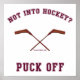 Not into hockey? Puck off! Only hockey fans welcome here. Support your local hockey player. Crossed hockey sticks with college letters.