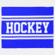 This sporty design features bold athletic HOCKEY text inside wide twin horizontal white racing stripes against royal blue background.
