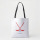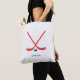 This custom tote bag features a sporty, playful design with crossed red hockey sticks and a blue and red puck at the centre — perfect for hockey fans or players. The design has a clean, modern look with bold colours that pop against the neutral tote background. Beneath the graphic, a personalised name adds a special touch, making it great for team gifts, tournaments, or everyday use.