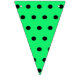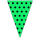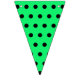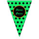 A neon green background with black polka dots... black centre circle with neon green lettering and orange accents...