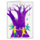 People dancing around purple tree. One guy holding a light on top of the tree, while a cat is napping on a tree branch.